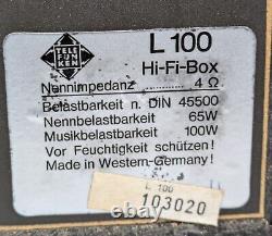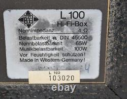 2 Telefunken L 100 Hi-Fi-Boxen, 100 Watt, W. 2 große Boxen zum Anschließen an einen Verstärker oder Anlage, altes Boxenanschlusskabel. Abmessungen: 275 x 453 x 223 mm (BxHxT). Bauart: 3-Wege, 3 Lautsprecher, geschlossene Box. : 65 W / 100 W.