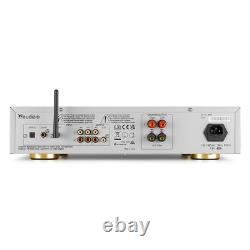 Headphone output on the front. Solid metal front in brushed stainless steel. Playback options: BT 5.0 streaming. Input connections: 3.5mm Jack, Optical, RCA.Speaker connections: Speaker screw terminal. Output power: Max: 2x 200W. Impedance: 4 Ohm, 8 Ohm.