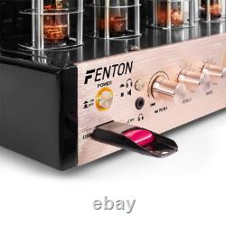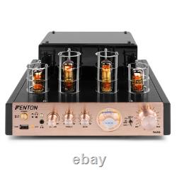 CCA2115 - Fenton 103.320 TA60 Stereo Tube Amplifier BT. The TA60 HiFi valve amplifier from Fenton is an extremely high-quality amp with chrome details and an aluminium front panel that fits in nicely with your interior home design. It has built-in valve tube preamplifiers, which provide detailed and warm tones when connected to suitable passive speakers. This HiFi tube amp allows you to pair a suitable smart device and stream audio wirelessly. This is perfect for casual home listening, as you can quickly pair a smartphone, tablet or laptop and play any music you please without any cables getting in your way. Another way to play music through this home stereo amplifier is by using the built-in MP3 player. By connecting a USB stick to the respective port on the amp, any saved audio files will play through the system in the order they are saved. This HiFi valve amplifier features adjustable bass and treble controls. By adjusting these controls, you can cut out or boost the low and high frequencies being reproduced through your connected speakers, resulting in a customised sound that works best for your preferences. There are two line inputs on the rear of the TA60 that allow you to connect various devices such as a mixing desk, laptop, CD player or smartphone. These inputs are also great for connecting to DVD players and TVs for video entertainment purposes rather than music playback. HiFi valve amp with tubes that provide a warm and detailed sound quality.Bluetooth connectivity to stream audio wirelessly from a paired smart device. Integrated MP3 player with a USB port to play saved audio files from a USB stick. Bass and treble dials to cut out or boost the low and high frequencies being reproduced.