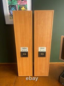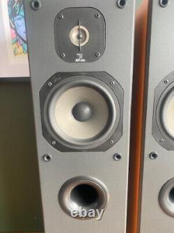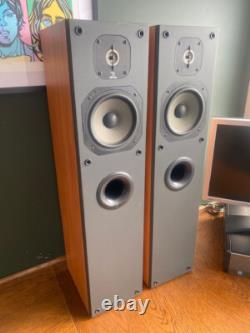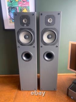 Enjoy the depth and clarity of your favourite music with these wired, standing speakers that epitomise the fusion of elegance and acoustic excellence. The speakers are in good working order. The speakers are in a good used condition with some minor marks and scratches as you would expect. The speaker grills are present but one has faded more that the other.