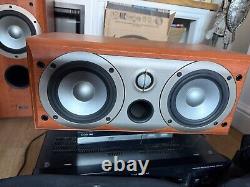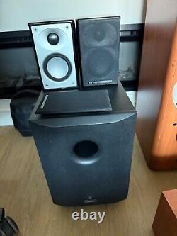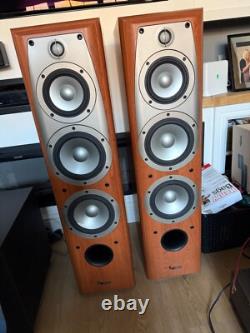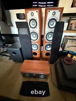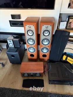 The Infinity Beta 40 Floor Standing Speakers in Cherry Finish are high-end speakers with a power output of 200W. Made of wood, the speakers are 100cm tall, with a width of 25cm and weighing 23 KG. They are wired speakers, designed in the United States, under the brand Infinity. The model offers exceptional audio quality for home audio and HiFi setups. Also it will include A Mission S8 Sub that sounds excellent with the speakers. Also two Mordaunt Short surround speakers with wall brackets, Also a Pioneer Amp that has a defect of a knob missing but still works fine.