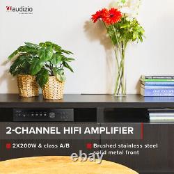 With its built-in Bluetooth receiver, the Audizio AD220B is a standout in the market. It enables easy audio streaming from a wide range of Bluetooth-enabled devices. Its front AUX input also enhances its versatility, allowing you to connect external audio devices. The Audizio AD220B provides several tone control options, including treble, mid, bass, and volume controls, making it easy to adjust the sound to your preference. It also has a headphone output, as well as subwoofer and line-out connections. This stereo HiFi amplifier has optical and coaxial inputs, providing the ability to connect it to TVs and DVD players. The build quality of the Audizio AD220B is noteworthy, featuring a solid metal front in brushed stainless steel, which adds a touch of class to your audio setup. To sum up, the Audizio AD220B 2-Channel HiFi Stereo Amplifier is a versatile, high-quality audio amplifier. Its Bluetooth receiver, AUX input, tone controls, and gold-plated speaker terminals ensure a high-fidelity listening experience that you won't forget anytime soon.HiFi stereo amplifier that is ideal for music lovers and as part of a home cinema system. Bluetooth technology and front AUX input to connect smartphones, tablets, and laptops. Coaxial, optical, and stereo RCA wired inputs allow for the connection of a wide range of external devices. Adjustable bass, mid, treble, and balance controls to customise the sound of the home audio amplifier. Subwoofer and line output connectors to expand the home stereo amplifier using powered speakers.
